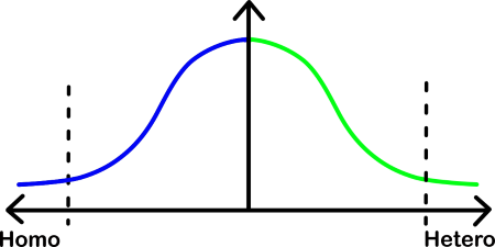 Nyní ještě na chvíli zpět k té fyzické rovině. Jsem osobně přesvědčena (na základě průzkumu mezi přáteli) a některé studie tomu též nasvědčují, že distribuce sexuální orientace v populaci by mohla odpovídat Gausově křivce. To znamená, jak už bylo zmíněno výše: